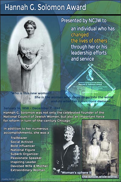 The award commemorates the spirit of Hannah G. Solomon, who established the National Council of Jewish Women in 1893. Ms. Solomon, an early social activist, led the organization in its landmark battles for laws restricting child labor, for child welfare programs, and for improved housing, education, and health care for the poor.